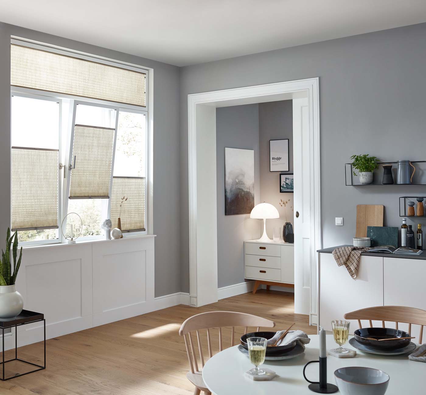 Ob als lichtdurchlässige, blickdichte Variante oder als Verdunklungsstoff, das Plissee überzeugt in allen Situationen. Für einen wohltuenden Temperaturausgleich sorgen die Luftkammern des Gewebes. Das heißt: effektive Kühlung im Sommer und Wärmereflexion im Winter. So reduzieren Sie den Energieverbrauch.
